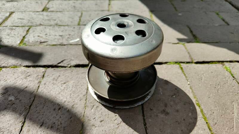 Afbeelding 4 CVT transmissie van een GY6 50cc 12 inch blok. (Links de variateur en recht de koppeling en secundaire poelie.)