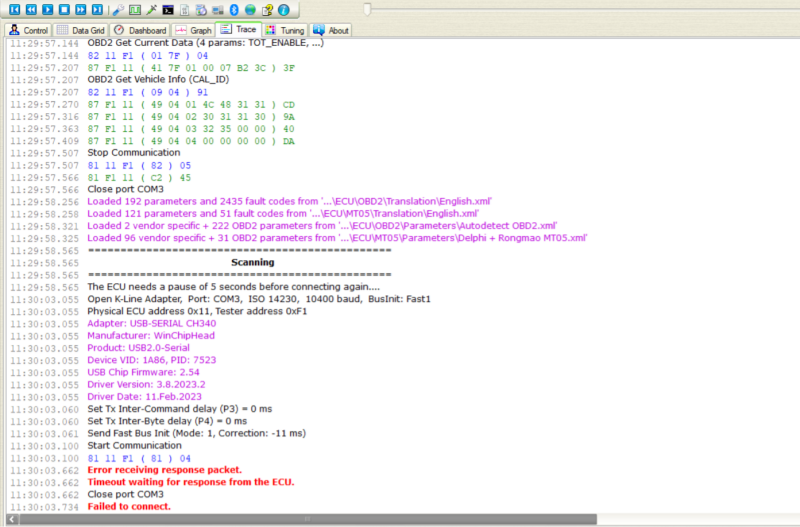 Maar je kan ook een andere melding krijgen tijdens het verbinden met de ECU. Zie hieronder:
