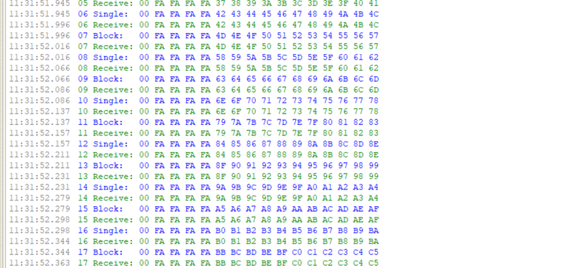 Nadat de juiste COM-poort is aangeklikt, kan er een check gedaan worden voor de OBD2 K-line kabel. Klik hiervoor op "Echo Test" en vervolgens op "Connect". (Zie afbeelding 6) Je ziet dan opeens veel data voorbijgaan, zoals te zien is in afbeelding 7. Als er niets roods tussen komt, is het goed. Ga vervolgens weer terug naar "Control". Het kan zijn dat het verbinden niet lukt. In dat geval gaat het programma automatisch naar "Trace" en staat er in het rood "Timeout waiting for response". (Zie afbeelding 9) Dit kan vaak gebeuren omdat K-line qua verbinden in snelheid erg gevoelig is. In dit geval moet je teruggaan naar "Control" en opnieuw verbinden totdat de Echo-test succesvol is afgerond. Het kan zijn dat je meer dan 10 keer opnieuw moet verbinden. Als het steeds niet lukt, is er kans dat de snelheid aangepast moet worden. Dit staat beschreven op de HUD ECU Hacker-site onder het kopje "Trouble Shooting" hoe dit moet.
